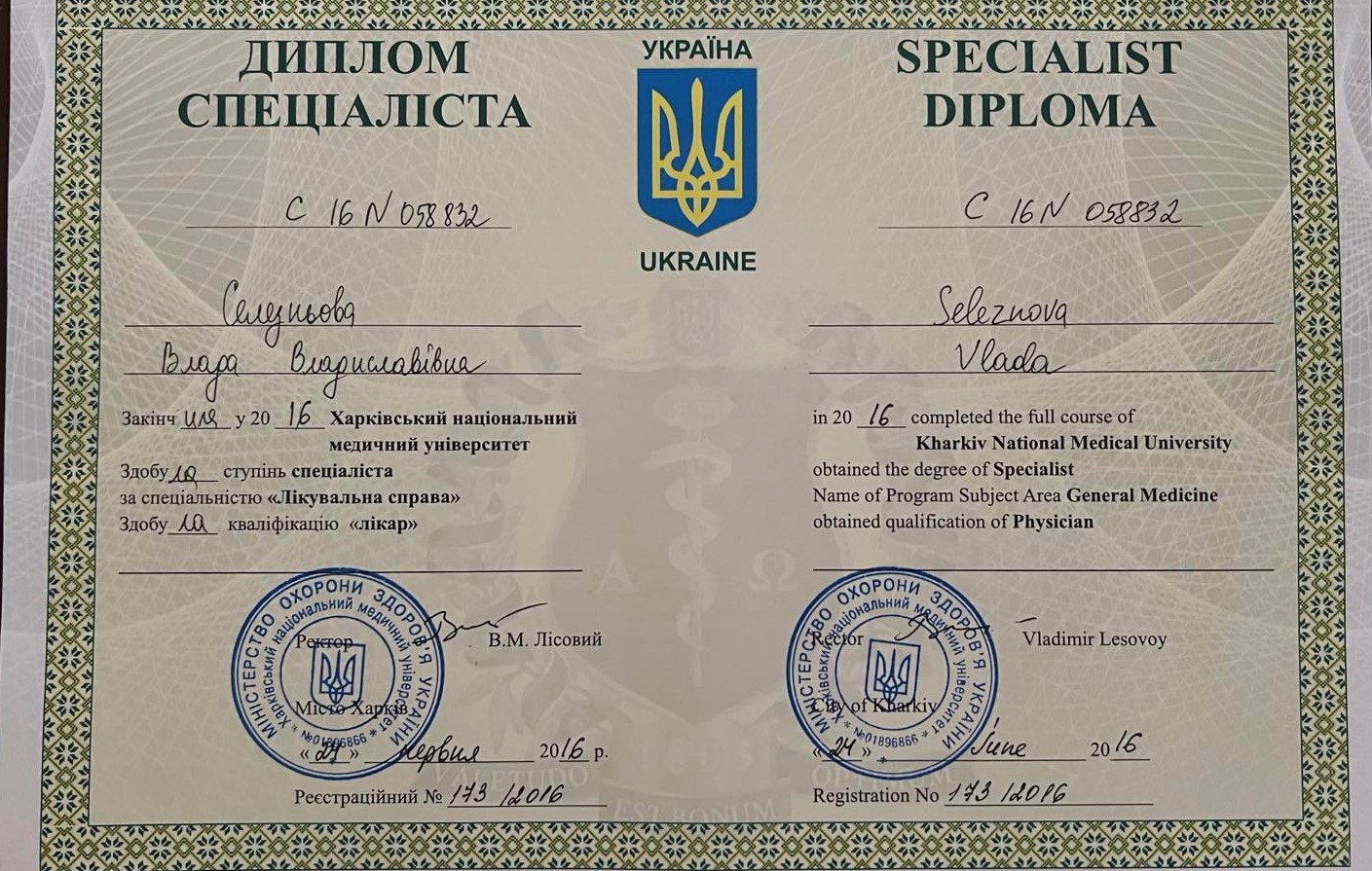 - 2010-2016 р. – Харківський Національний Медичний Університет, спеціальність “лікувальна справа”.