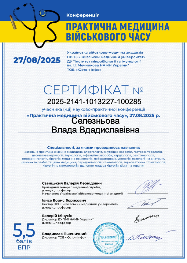 Селезньова Влада Владиславівна отличный специалист, лечение помогло, проблема решилась в первый же день:) Остались только хорошие впечатления от приёма.