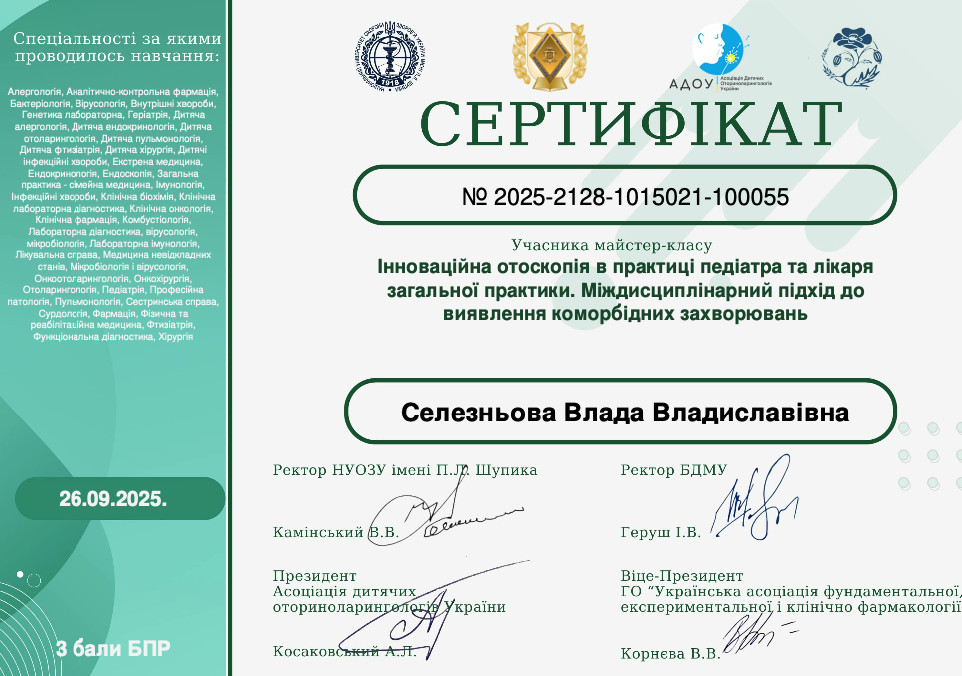 - 2020 р. – підвищення кваліфікації на базі Харківської медичної академії післядипломної освіти за спеціальністю дитяча отоларингологія.