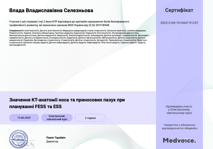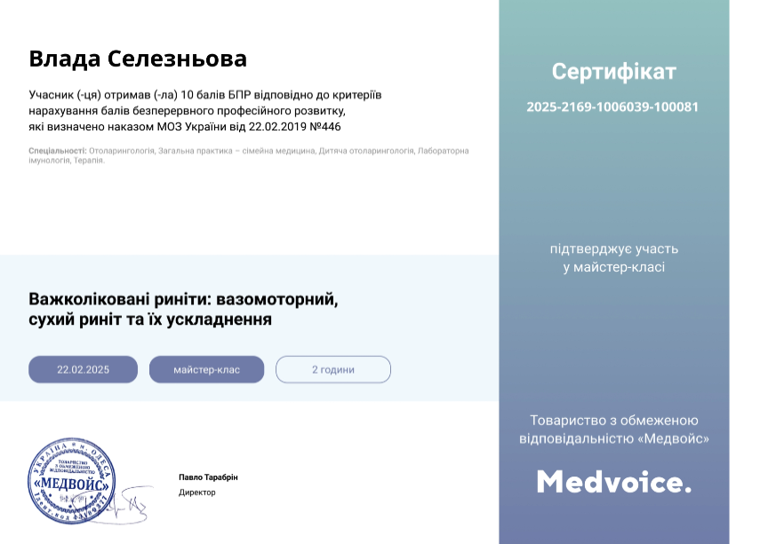 - 2020-2022 р. – дитячий та дорослий лікар отоларинголог у приватній клініці.