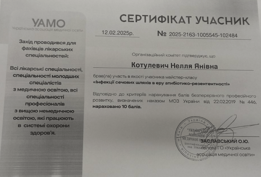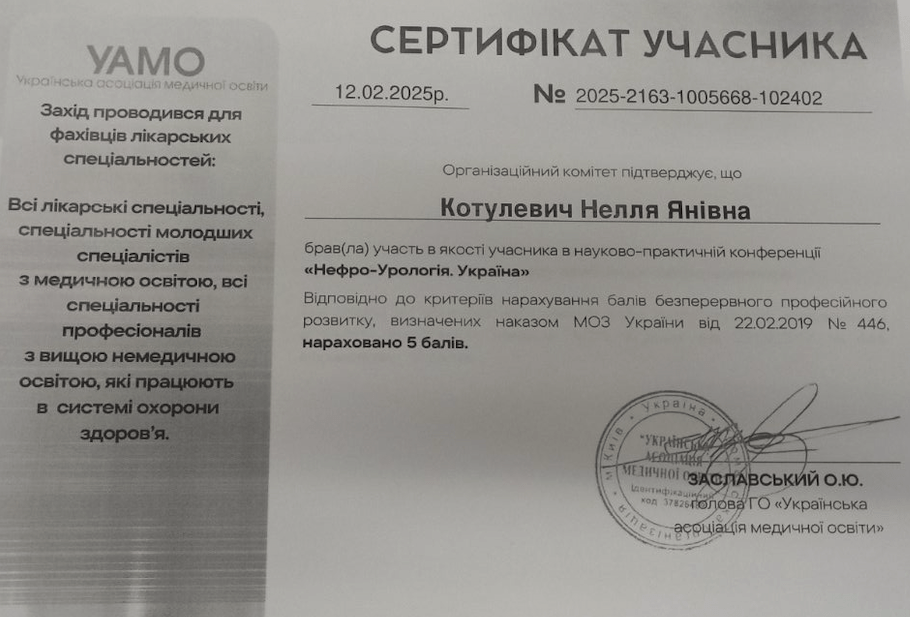 Консультация нефролога повторная в течение 1 месяца 600 грн