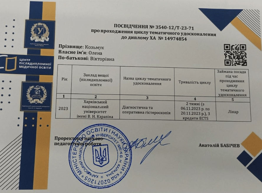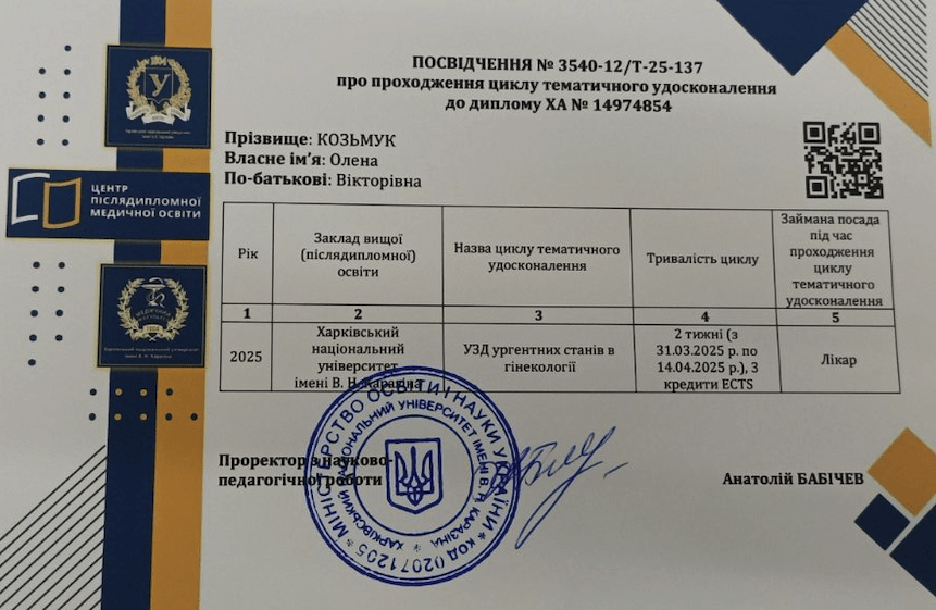 Окрема вдячність лікарю акушеру-гінекологу Козьмук Олені Вікторівні за професіоналізм, турботу та щире ставлення до пацієнтів.
