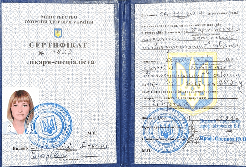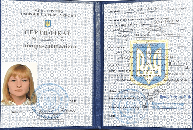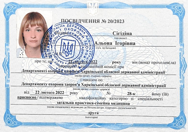 Сигидина Алёна Игоревна – опытный врач-терапевт и семейный врач с общим стажем работы более 15 лет. Окончила Харьковский национальный медицинский университет в 2010 году (факультет «лечебное дело»), после чего успешно прошла интернатуру по специализации «внутренние болезни, терапия» в Харьковской медицинской академии последипломного образования (2010-2012 гг.). В 2017 году получила специализацию по направлению «общая практика – семейная медицина».